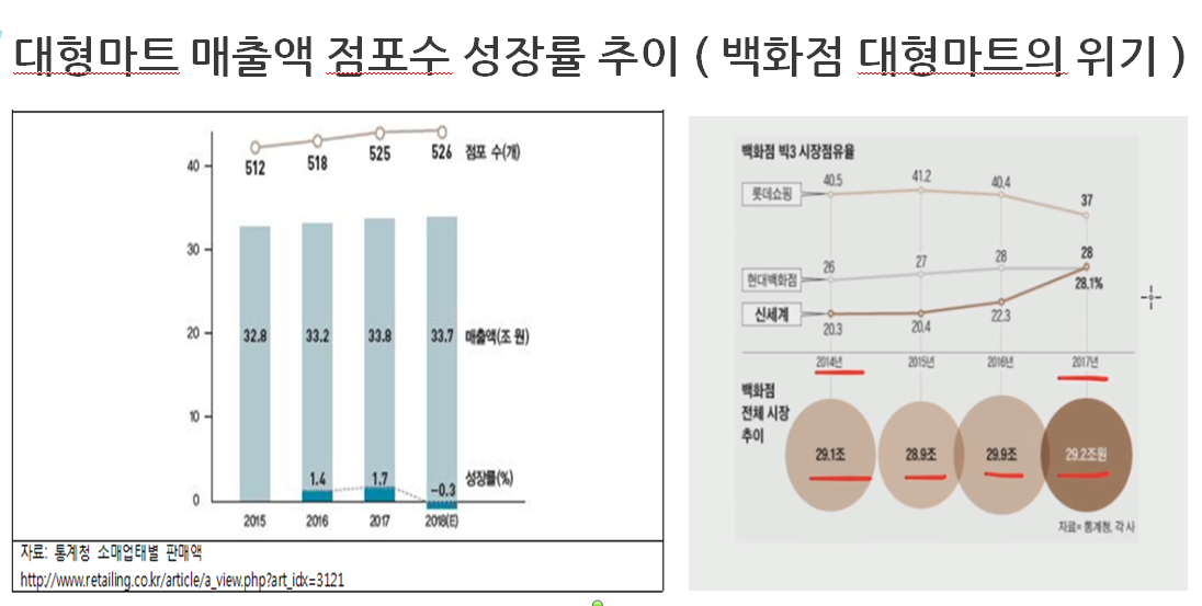 오프라인쇼핑동향 (대형마트 매출액 점포수 성장율추이, 빅3 백화점 시장점유율)